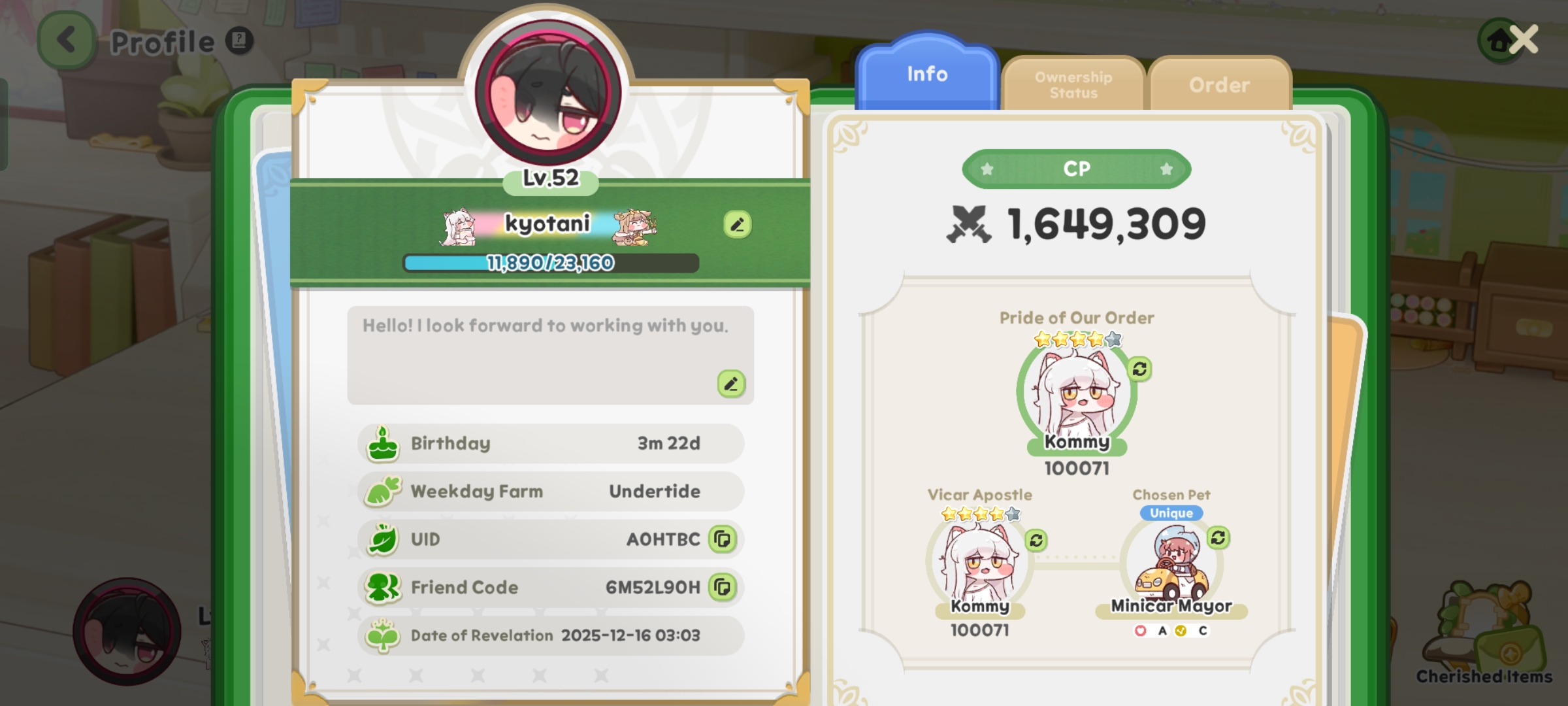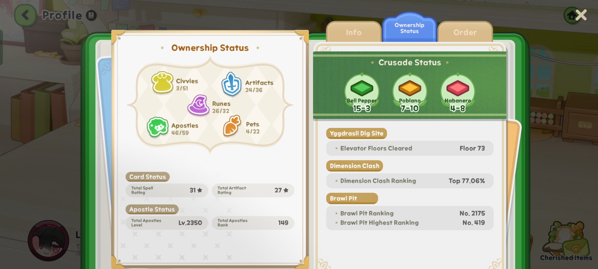 a somewhat stacked, mid-game type of profile. my profile has multiple pages, so i screenshotted 3 of those for view and you can click on the profile pages here to change the view. while i was playing this, i'm kind of stapled to the Depressed Apostles (aka Dark units) ever since Kommy is the first to hit 100,000 and my other Depressed Apostles that are 3 gold stars soon. the total power will grow overtime due to me ranking up all of the available Apostles, even 1-star and 2-stars that are not gold star Apostles, since they also give out permanent stats to all Apostles.