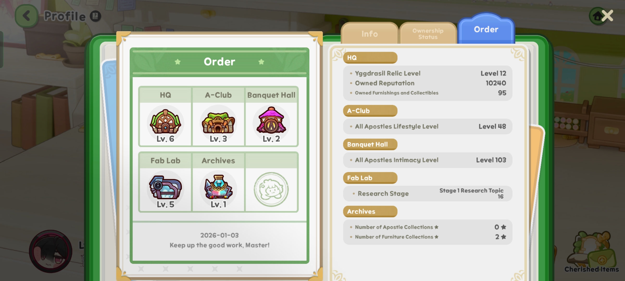 well, this profile that i have is where i reached the mid-game content since the game gets updated for new story chapters until that doomsday timer sets to 0 days, which is what happened in the prologue when you started playing the game. i didn't bother to get a max star Cacao (which only requires event currency to pull) on this account, so it's currently stapled into a 4 star instead. this profile is on the SEA version of the game, but if you happen to find me on the Global version; hats off to you, i guess...
